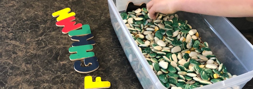 We started off the day by having an alphabet hide and seek. I have a few sensory containers that I use for different school activities. This little shoe box tote is filled with Lima beans that have been spray painted. I threw the capital letters into the sensory box and had my little guy dig letters out one at a time. He told me what letter he’d found and then we put them in order on the counter.