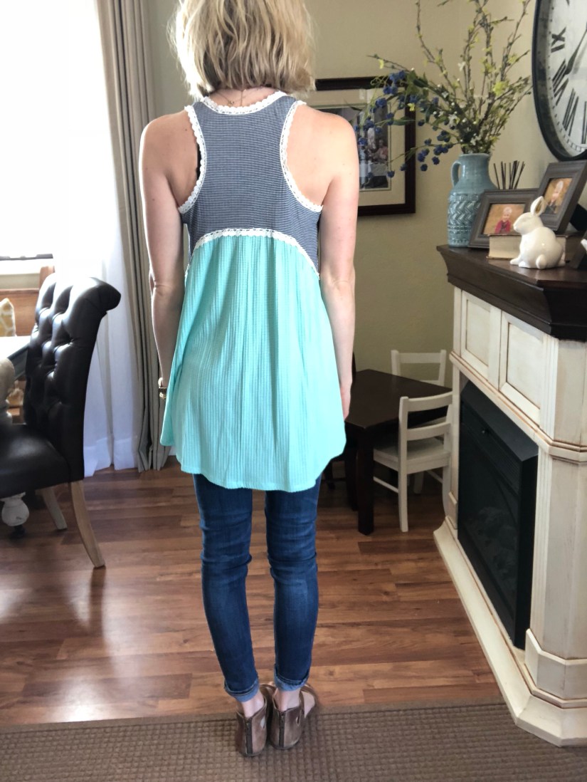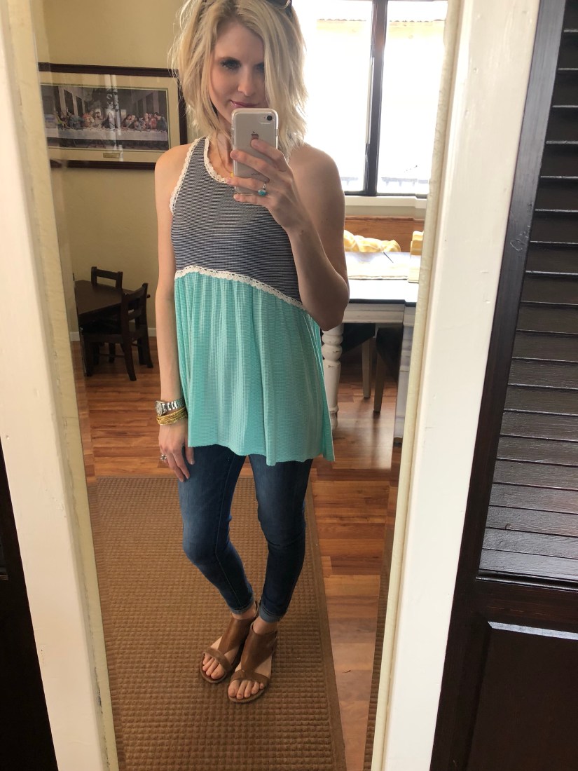 This cute top definitely runs big, but I like that it is oversized. This was the first time I tried the tank on. I know it will look cute with shorts, leggings, and possibly a denim jacket or blazer over it. I’m also digging this top for new mommas because it would be awesome post baby or even before baby comes!! Forgiveness..need I say more??