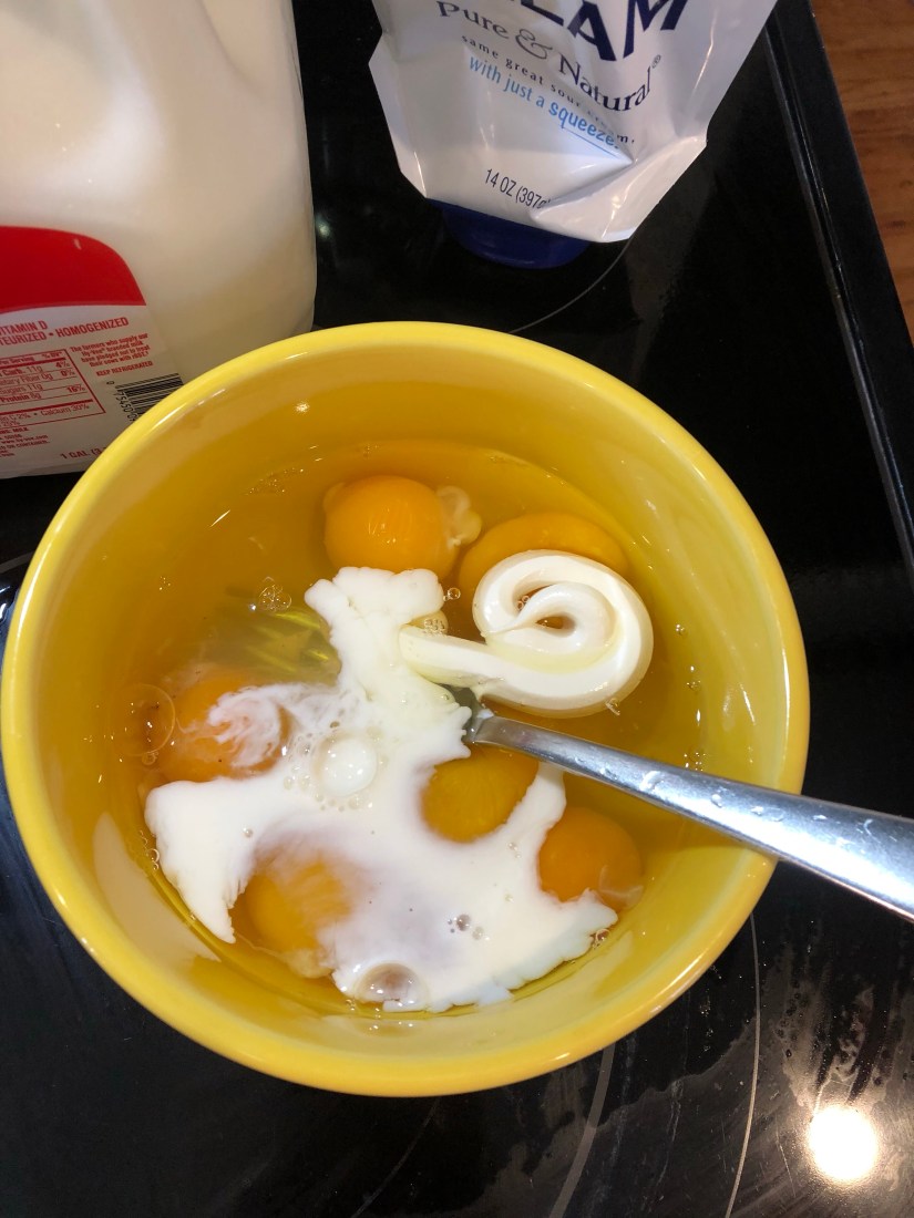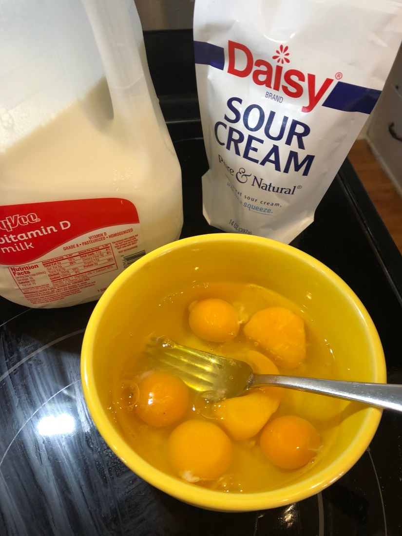 First I took six eggs, about a 1/4 cup of sour cream and 1-2 tablespoons of milk and whisked them.