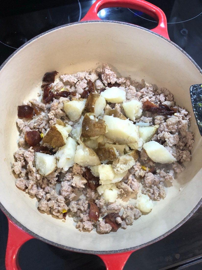 Next I added one of the diced cooked potatoes, and warmed it. I didn’t peel it, but you could.