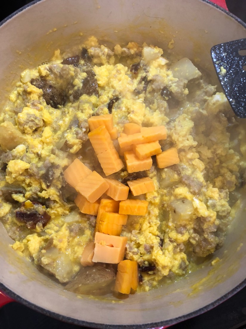 Now add about a half of cup of cubed cheddar, or you could used shredded.