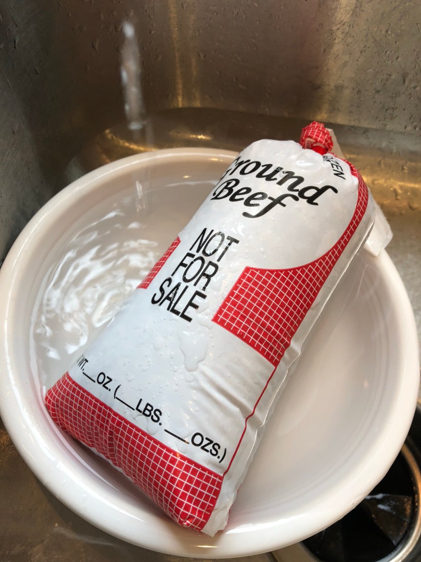 Everyone drops their coats, shoes and sometimes their church clothes right by the door as soon we enter, despite my yelling, “Hang up your coat!”. Does this happen in other homes? I cut right through the chaos of undressing and grabbed a pound of hamburger out of the freezer. The hamburger was placed into a bowl under a dripping faucet of cold water. This is a great, semi-fast way to safely thaw meat. The plan was hamburgers on the grill. When I thaw meat in the microwave, it doesn’t work too well for hamburgers on the grill. Then I joined the chaos by hanging coats, changing clothes, etc.