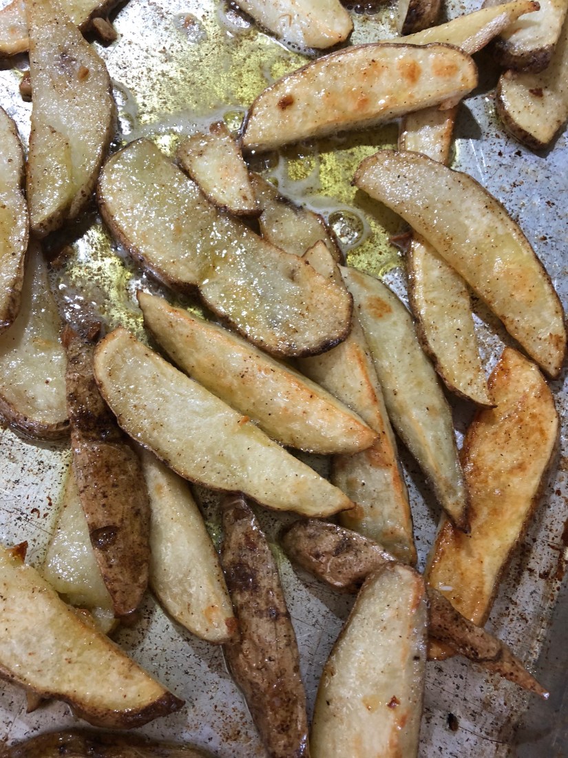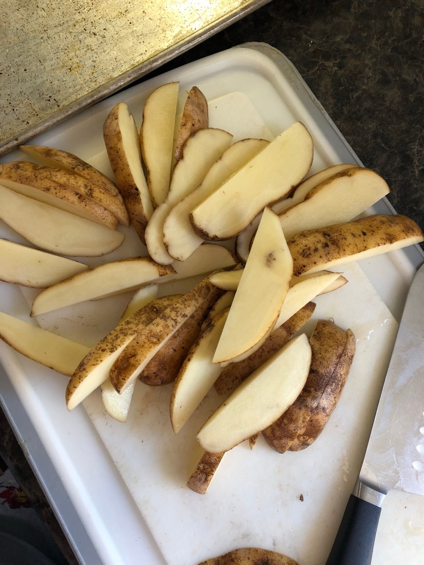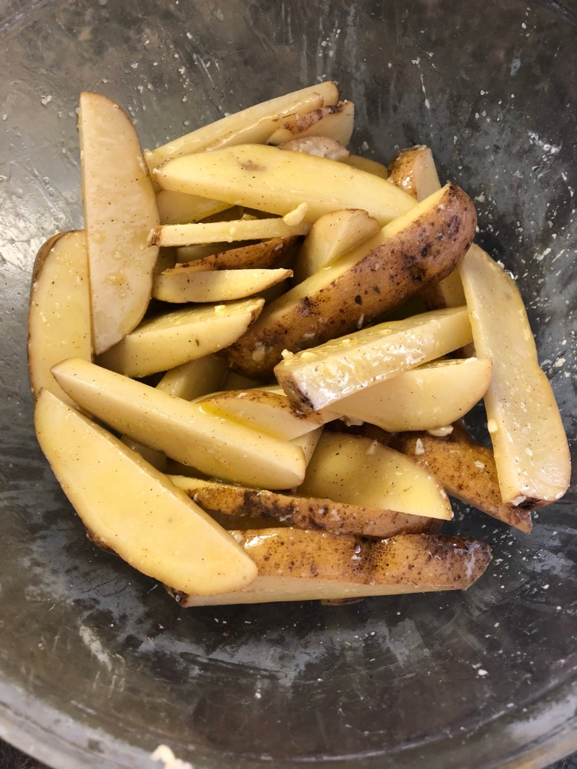 Make sure to dry the potatoes so they cook faster. Cut the potatoes in half and then try to quarter each half , this should give you eight wedges per potato.