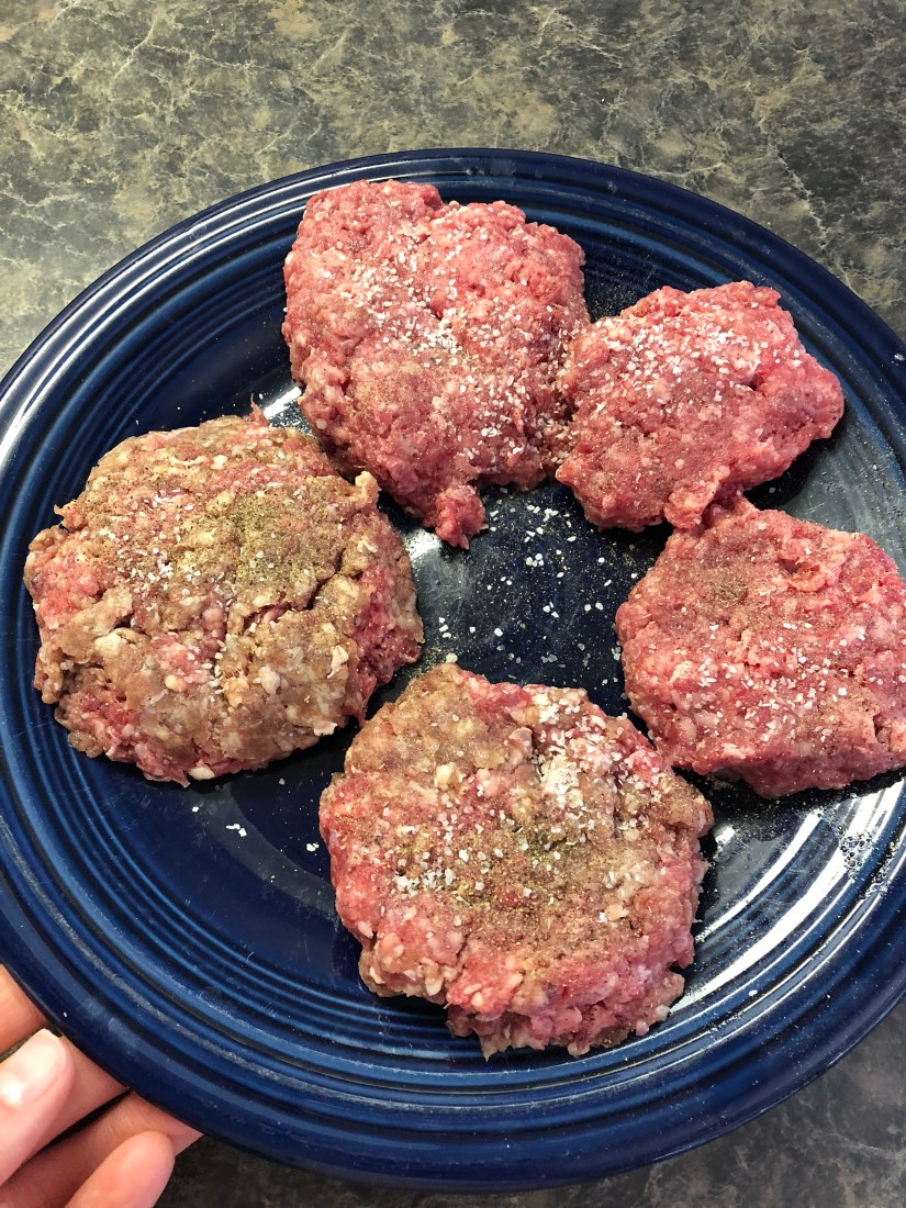 While the potatoes were roasting my hamburger was almost thawed. I took off the thawed stuff, and made patties. The other frozen hunk I tossed in the microwave at 40% for two minutes. Pat out all the burger, and season with salt and pepper. If you are like me and were not working with thawed meat to begin, its a good idea to put the patted out burgers in the freezer for 5-10, so they don’t fall apart on the grill.