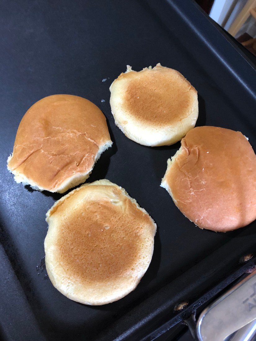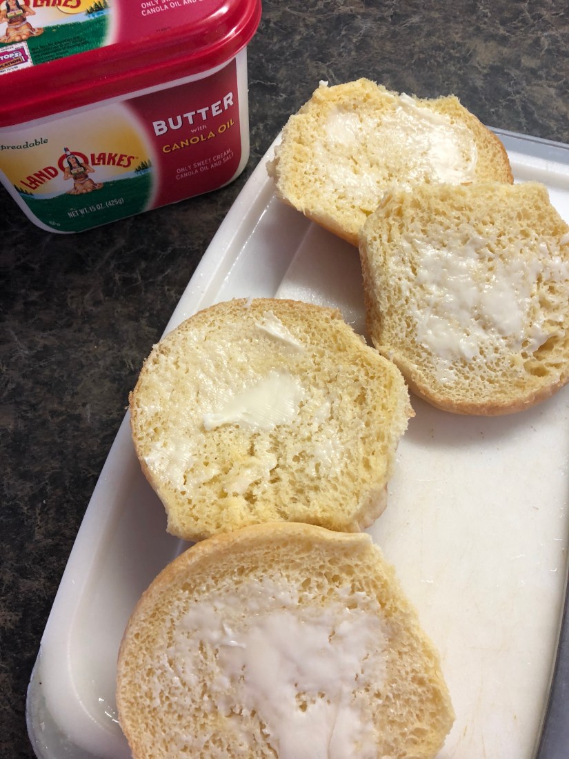 Grill the burgers. I also grilled my buns…my eyebrows were already cooked, might as well do my buns, too. 😉 Spread butter on both sides of the bun.
