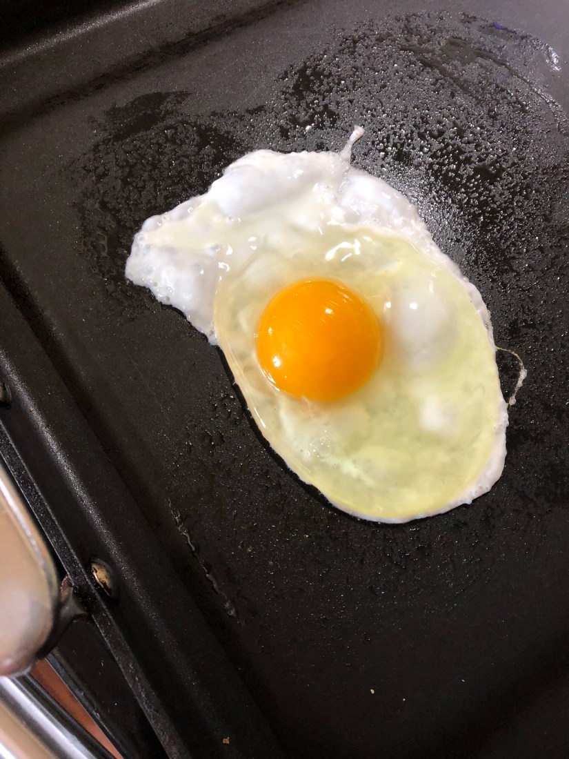 My husband doesn’t like the egg goo, so I break the yolk and hard fry it.