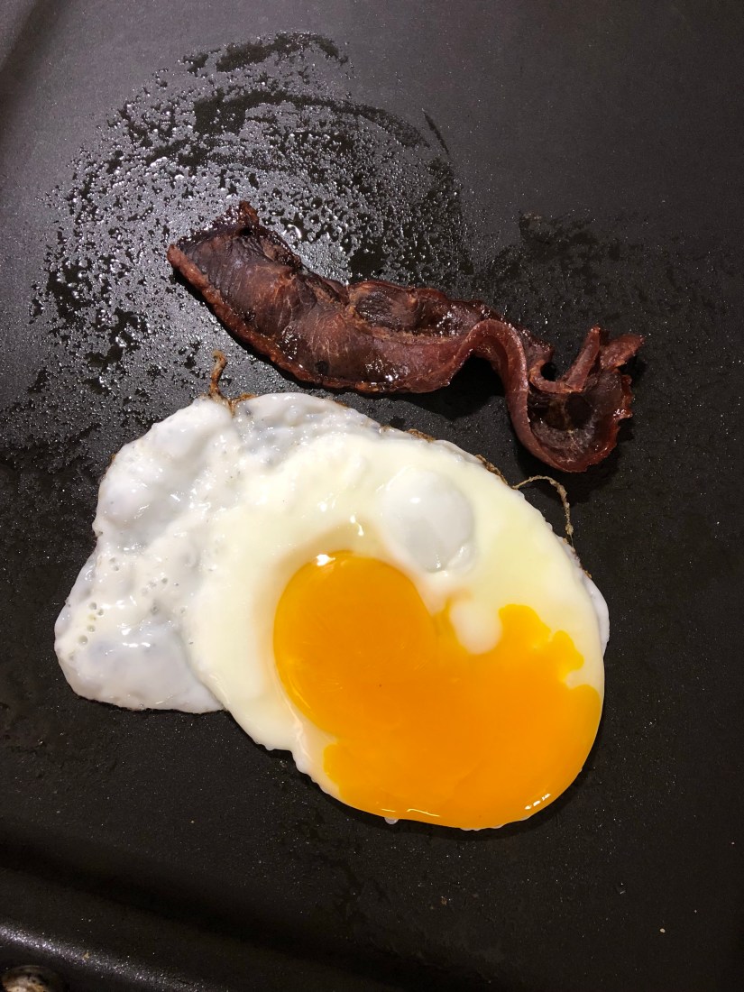 Everyone in my house likes their burger differently. Today I was feeling extra generous, so I offered to fry an egg for my husband’s burger. He loves a breakfast burger. I had some cooked bacon, so while the egg was frying, I laid the bacon next to the egg to warm it. When I add an egg to my burger, I like it runny.