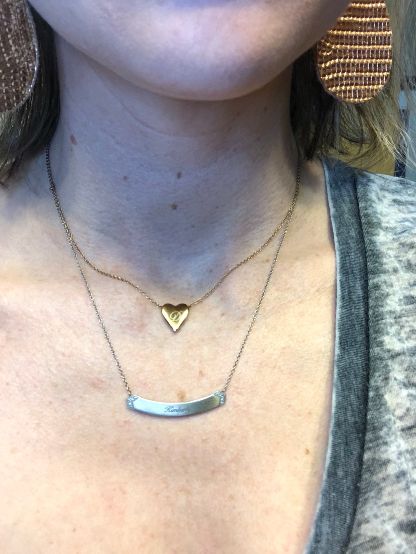 My necklaces are from Keep Collective. Engrave what you want. I have D for my husbands name, and the other has my name engraved. Use this code for $10 off🍾