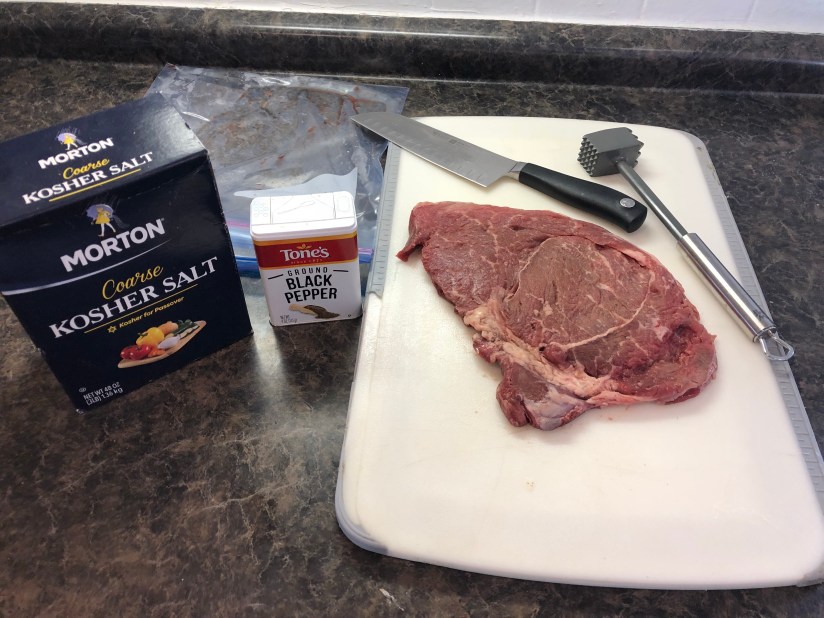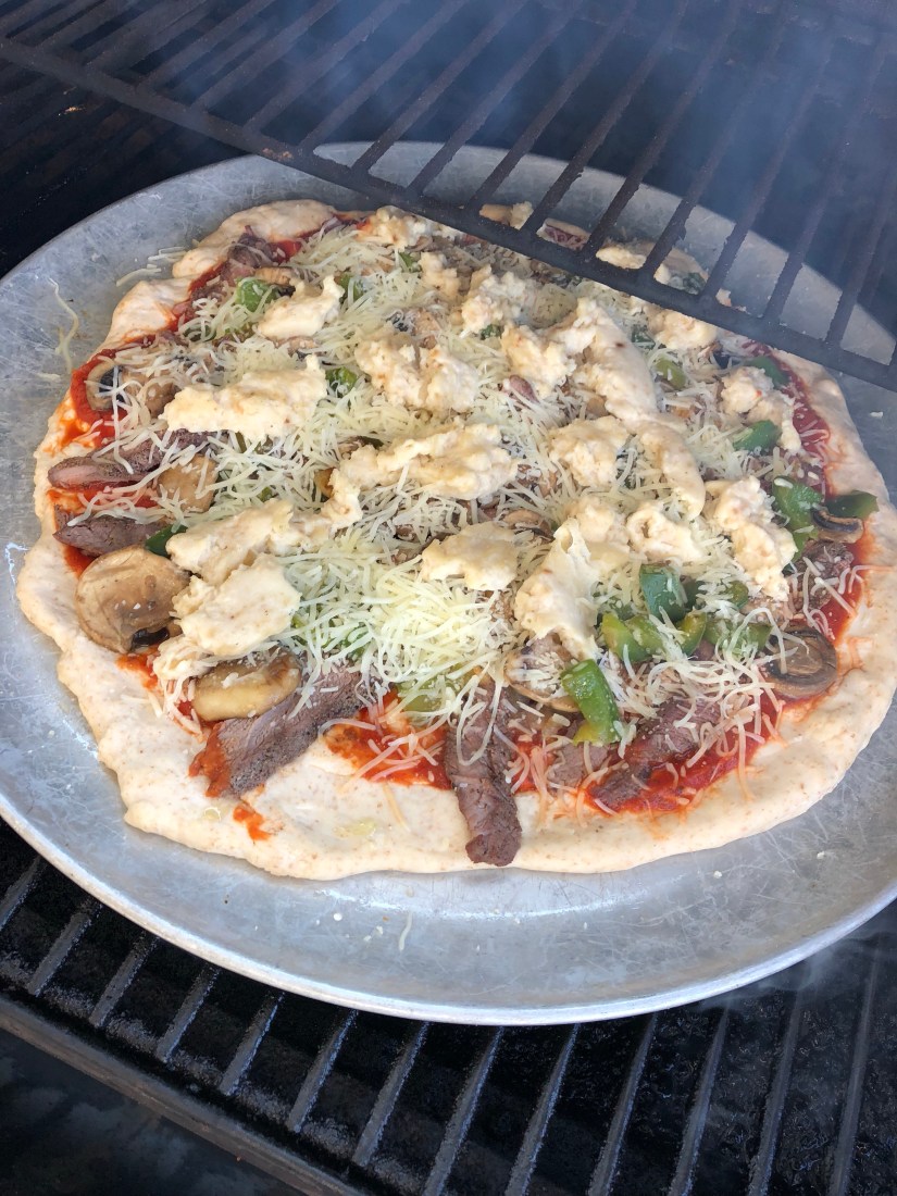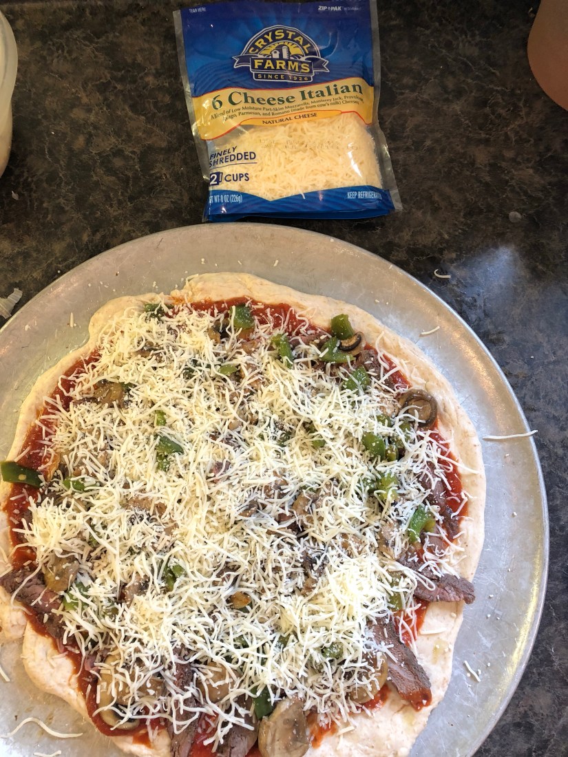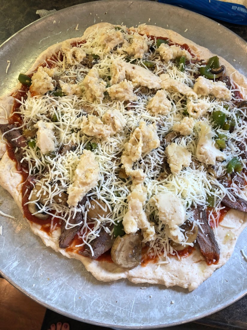 Derek will make sly hits as to what he wants to eat, by bringing up some food from our basement freezer and placing it in the fridge upstairs. I found a sirloin steak in the fridge and thought, let’s re- create the date night pizza!!!