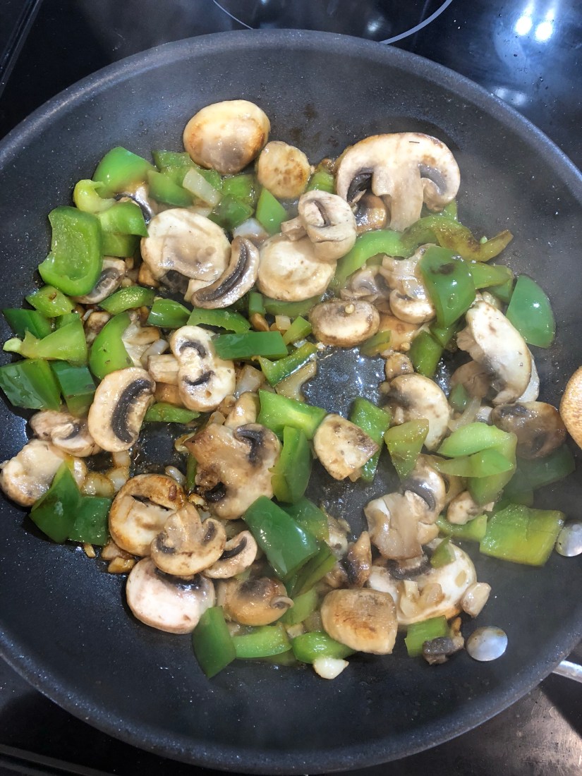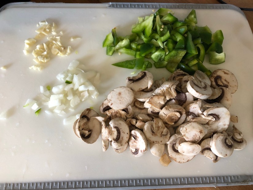 Chop up 2-3 garlic cloves, part of an onion, half of a green pepper and 2 cups of mushrooms.
