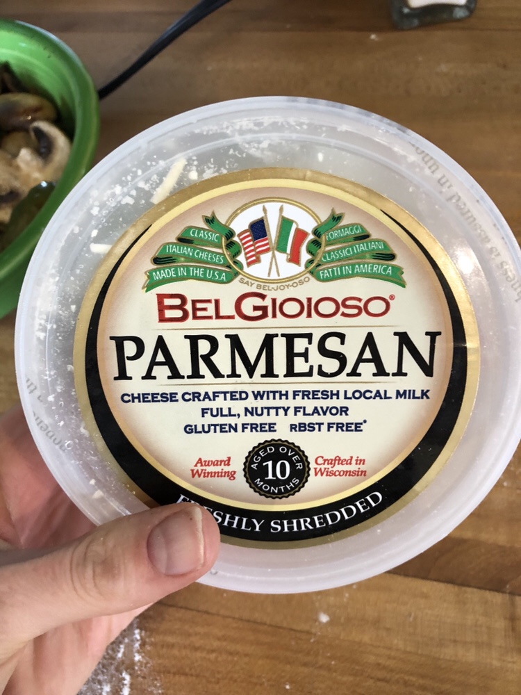 Add a handful of Parmesan cheese. I use this stuff and keep it in the freezer. It’s awesome! Season with salt and pepper.
