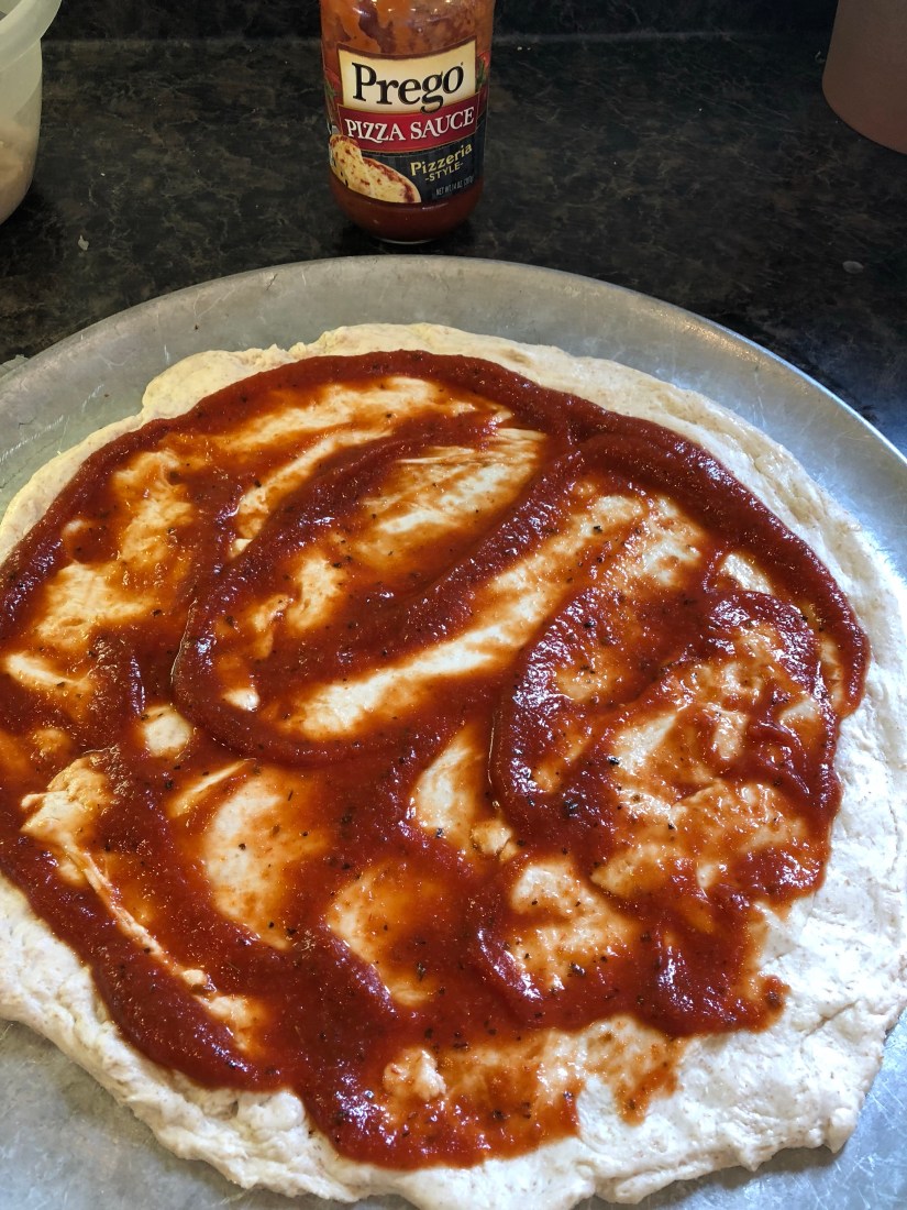 Spread your dough on your pan. I was using an air back pan because I wanted to grill our pizza. You can do many different things here: use preheated pan for pizza in oven, or use a prepared dough. Spread pizza sauce on.