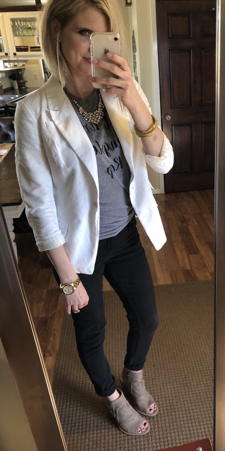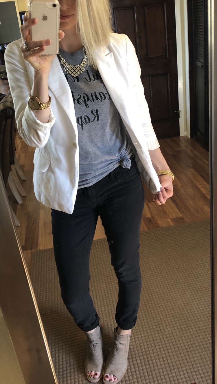 Iβm kept my look pretty casual with a tied T-shirt under this blazer.