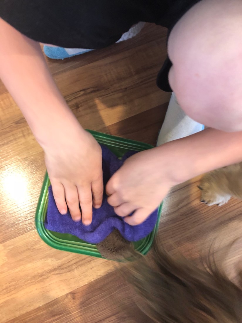 Our egg did crack, slightly. 😦 We said we would put more washcloths in, next time.