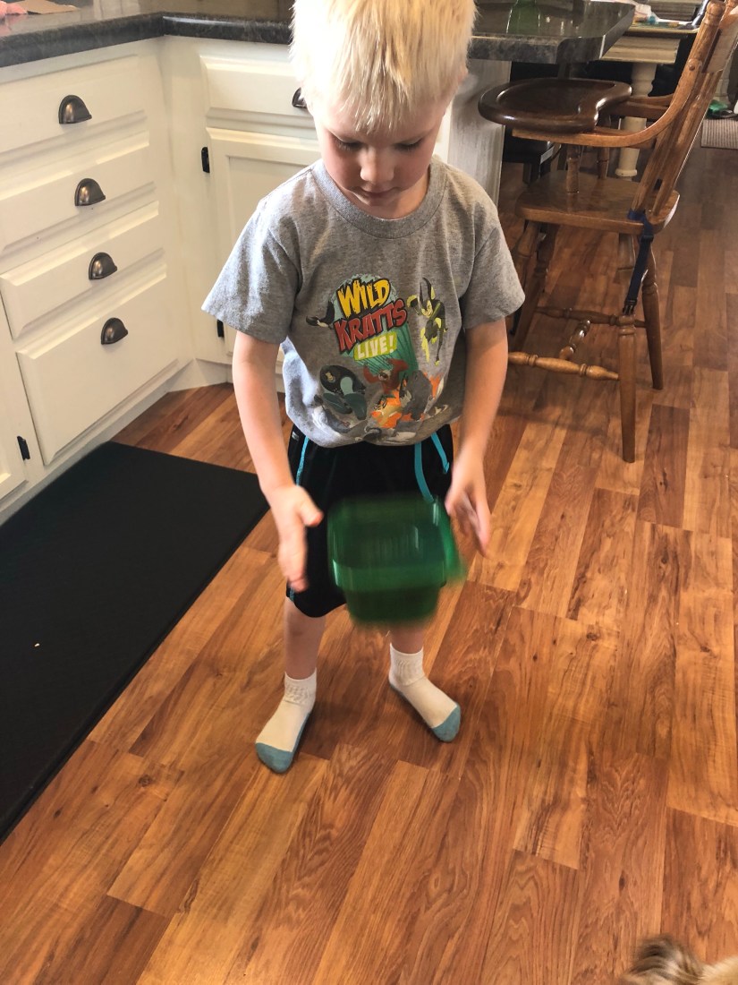 Lastly, we had an Egg Drop Experiment. We talked about the word fragile. I told Sam I was going to give him a container, he was going to make it so the egg wouldn’t break when we dropped the container.