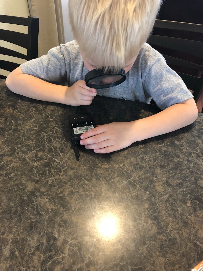 O is for OBSERVATION. This is a new, big word. We talked about what is means, then I gave him a magnifying glass. He loved looking at a cellphone from 1999. 😉