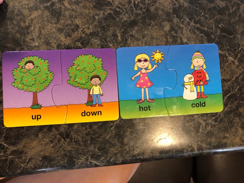 We’ve been talking a lot about opposites. So, we played this great opposite game. I divided the cards into two groups. Sam would pick one, I would tell him what it said and he would look for the opposite.