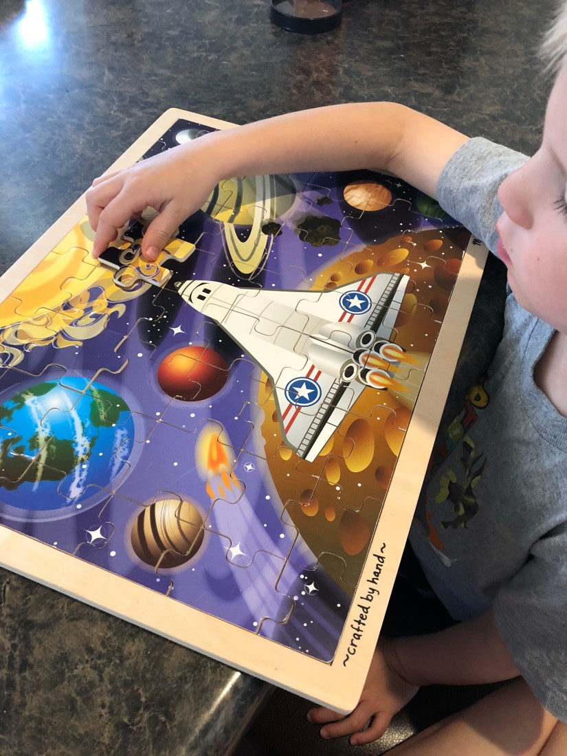 I’m a HUGE Melissa and Doug Puzzle fan. This was a larger puzzle than my Sam is used to. We worked on this together and talked about strategies.