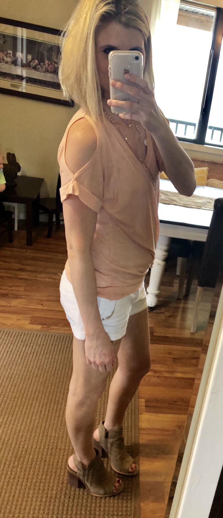 Top, wearing small π https://rosegraceboutique.com/collections/tops-cardigans/products/blush-speckled-cold-shoulder-top