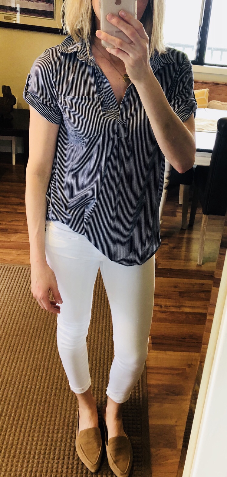 This Top is sooo soft, (wearing medium) I sized up for a more roomy fit πΊ https://rosegraceboutique.com/collections/tops-cardigans/products/navy-white-striped-short-sleeve-tunic-top