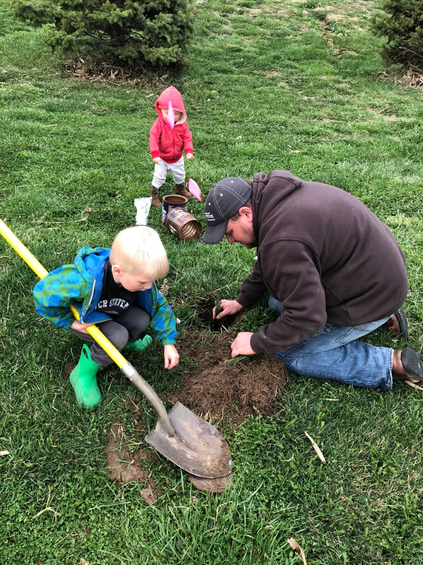 Jake brought home some seedlings from school last week. Derek said tonight we would plant them. Baby Max was so excited to place the flags next to the trees. What are the flags for…so Mom won’t hit the new trees with the mower.