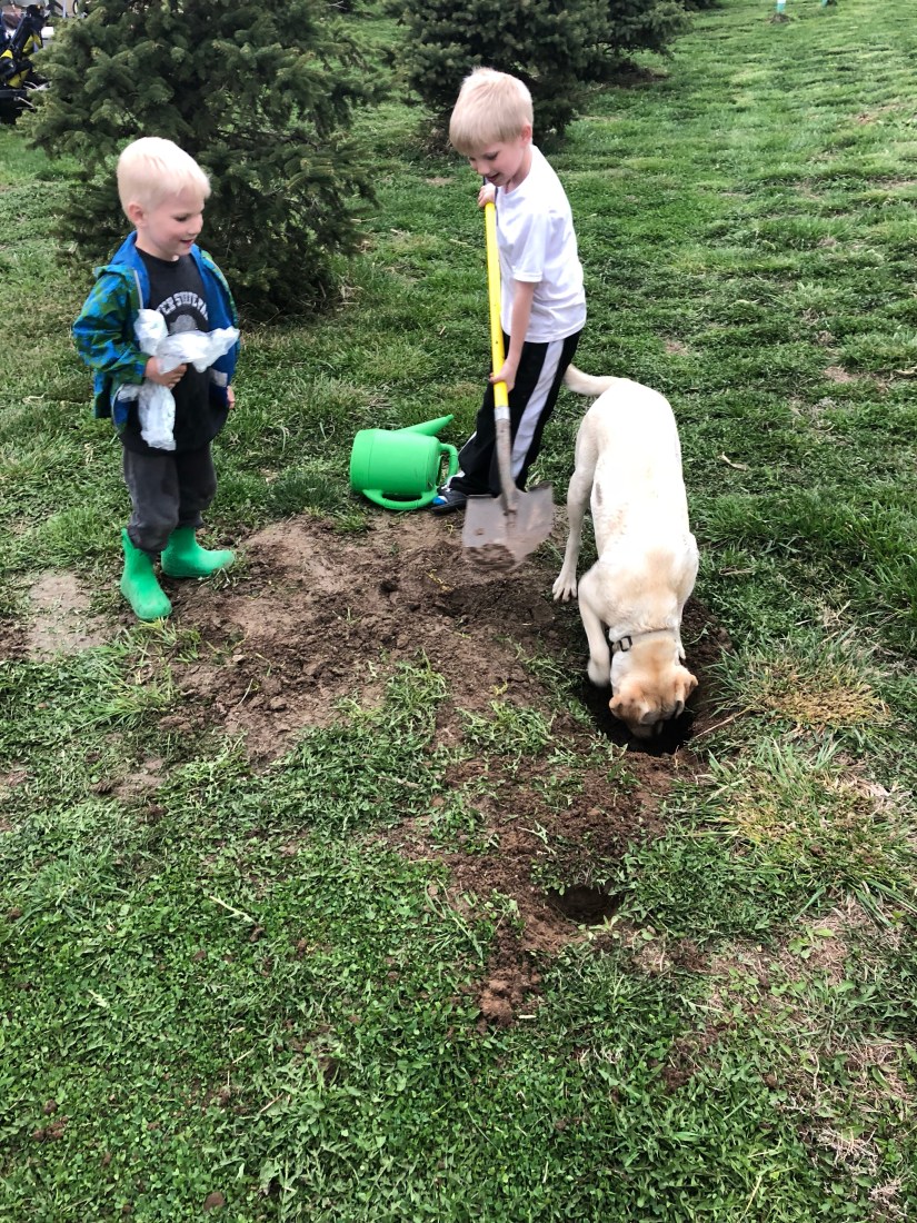 Max wanted them to hurry up and get the tree in the hole. Where was Jake? Well, he was practicing casting his fishing pole in the driveway. But I THINK at this point he was filling up the watering can with water.