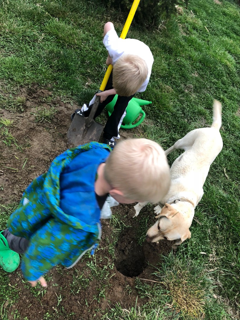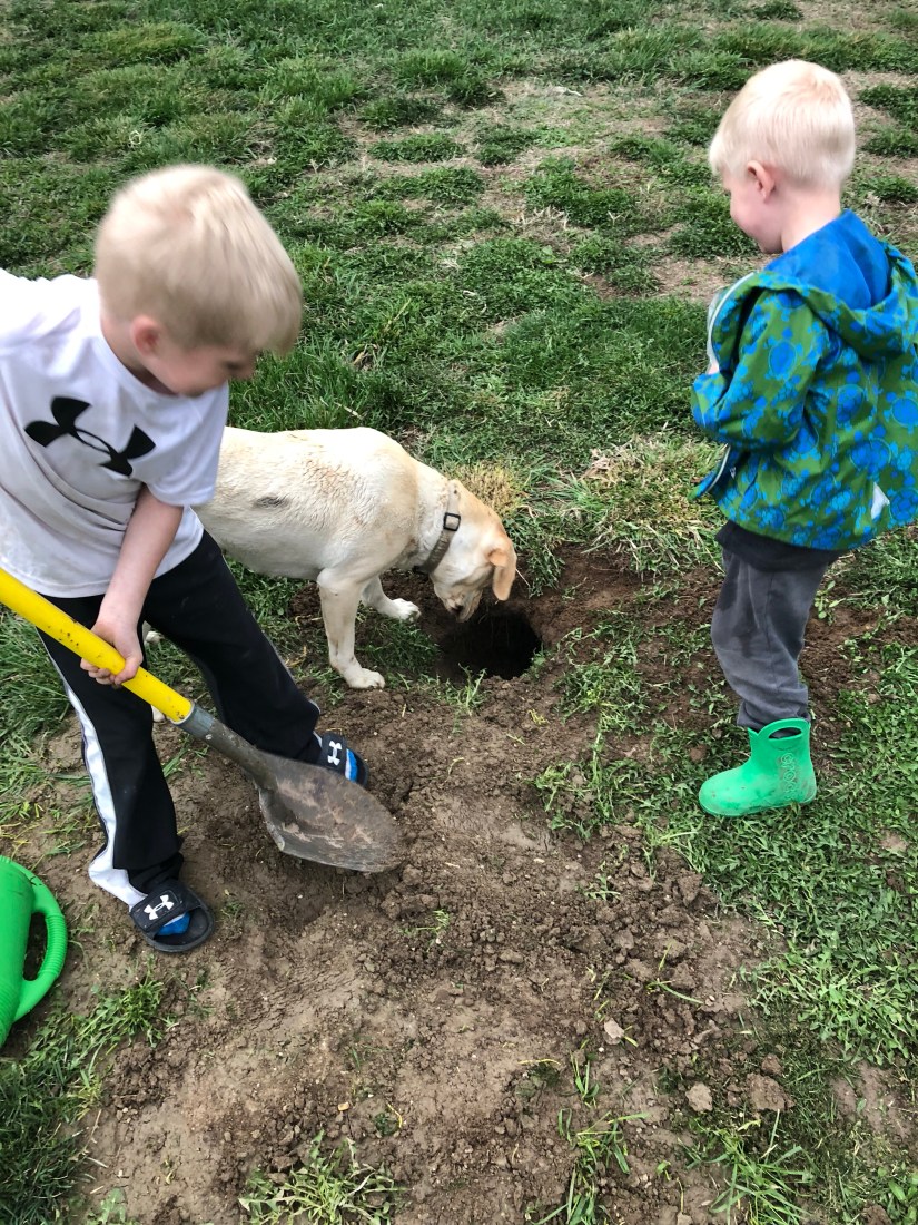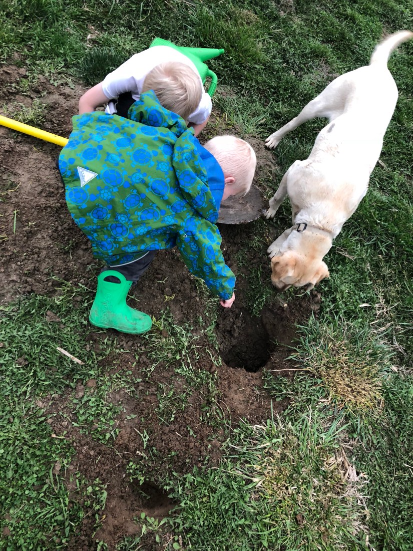 Now the boys found a hole. They want to know what lives in there. They are so kind hoping to scare out a bunny. 😉