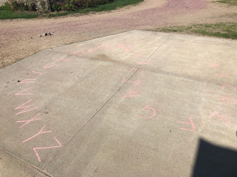 I try to teach as much school outside, as possible. This is a race car alphabet track.
