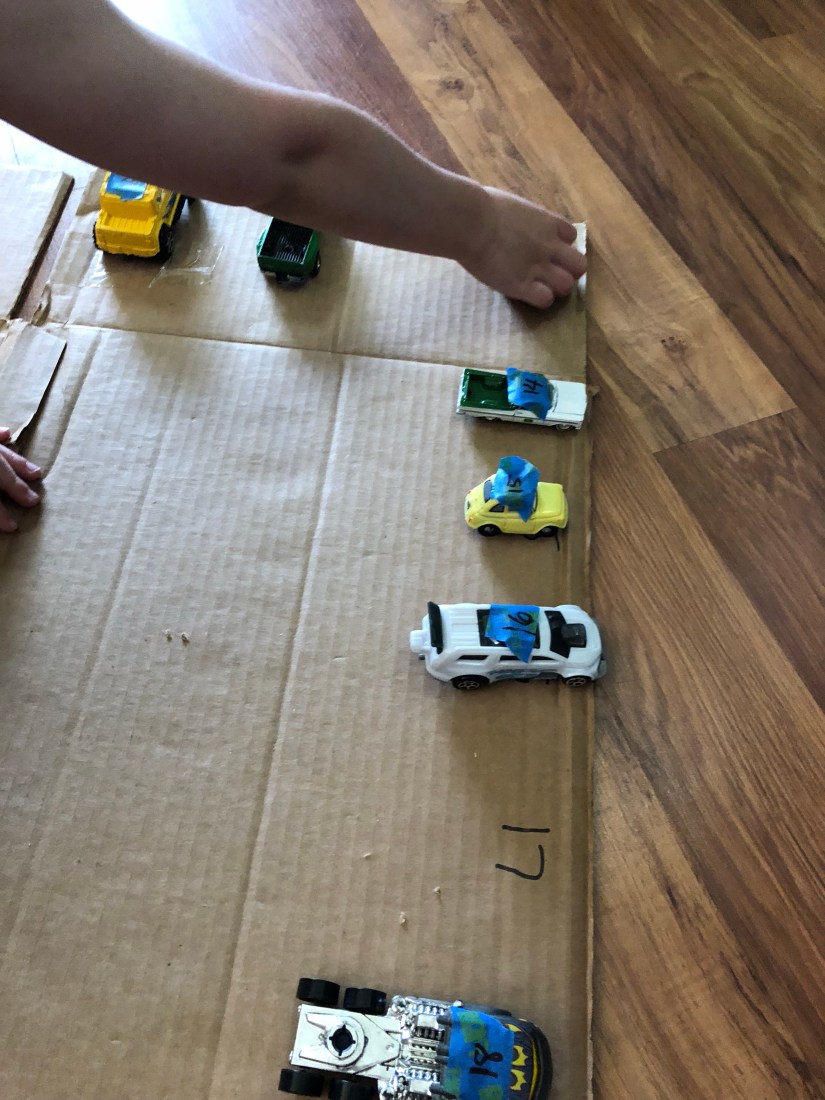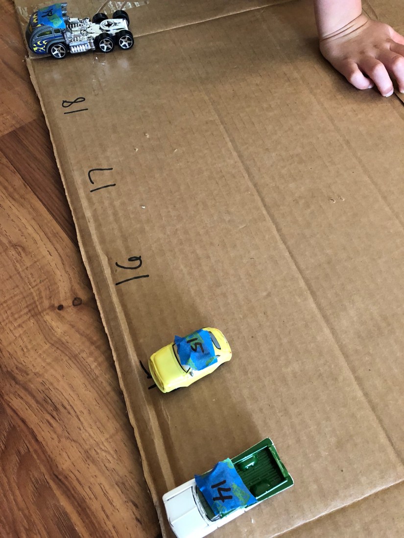 Your little one will drive the car to the correct number. The first garage I ever made for Sam, the numbers only went up to 10. On this day, we went to 24.