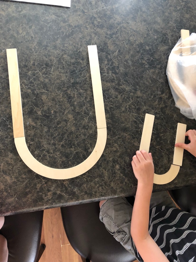 Using these awesome wood pieces next, Sam built the letter U.