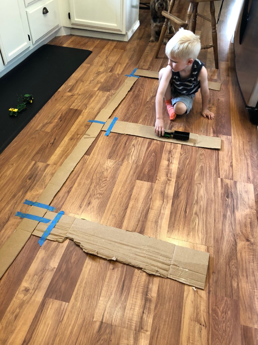 The last thing we did was make roads with pieces of cardboard. This is a simple, fun thing for kids. I’m all about free play here!!