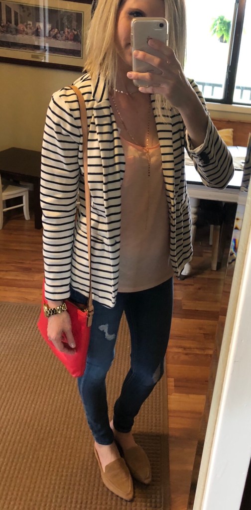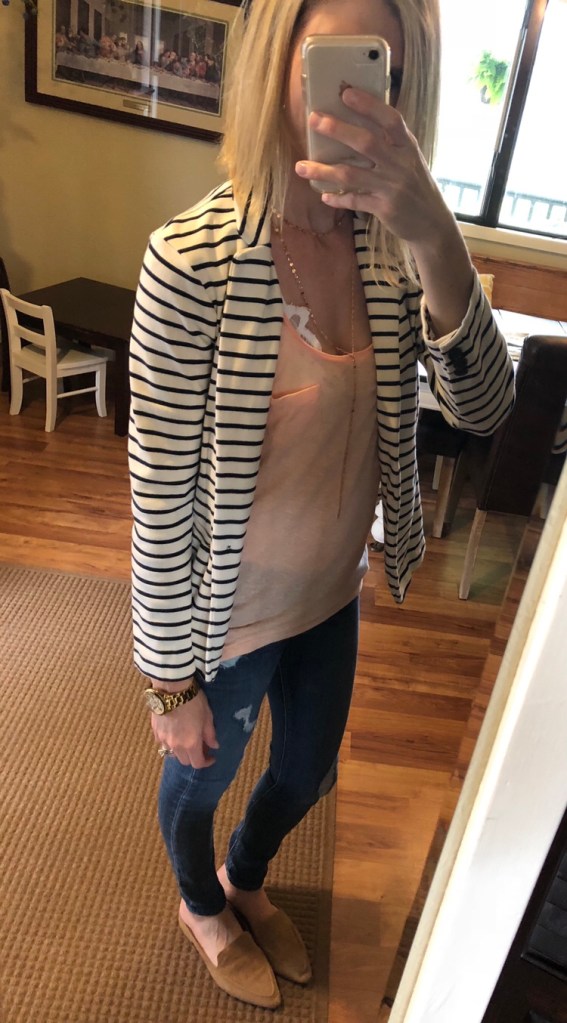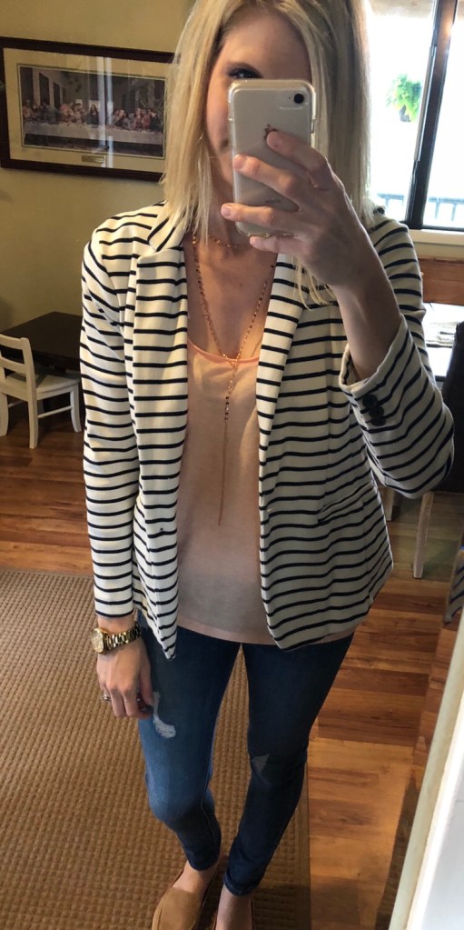 I love blazers. I also love simple colors and looks. I bought this blazer last year. Part of the reason I bought it, was to wear over a dress. I’d just had my third baby, and I needed to hide a lot of things!! This blazer is almost like a sweatshirt material, its so comfortable.
