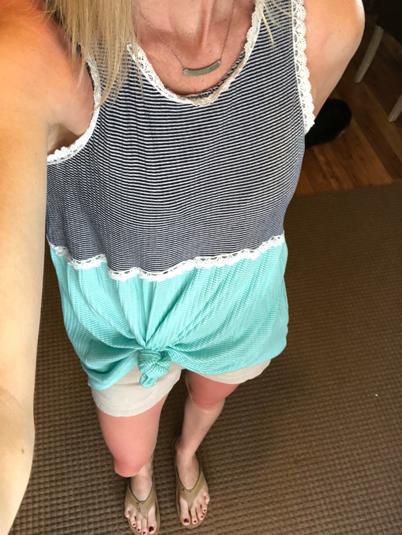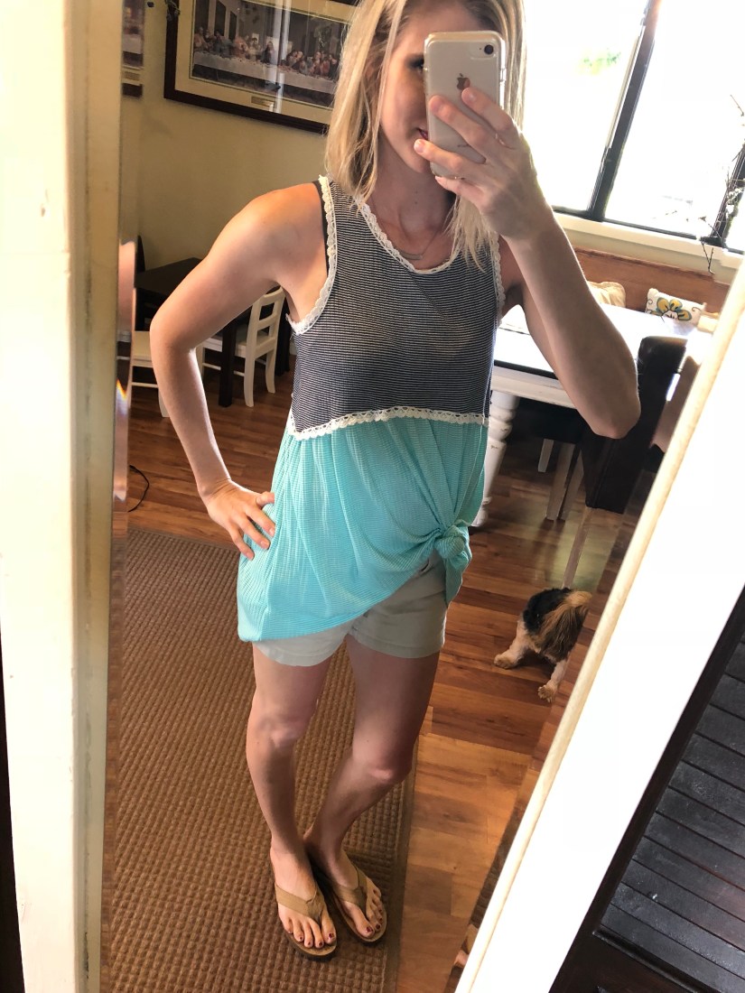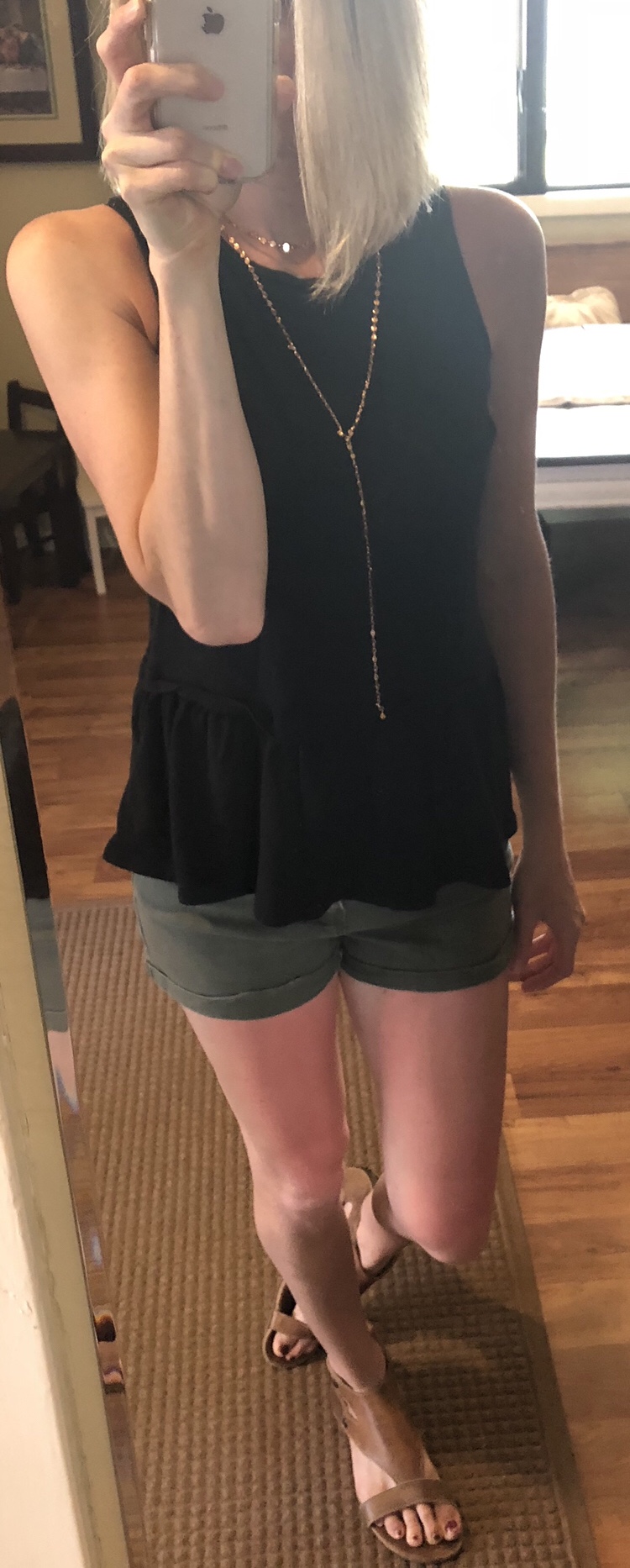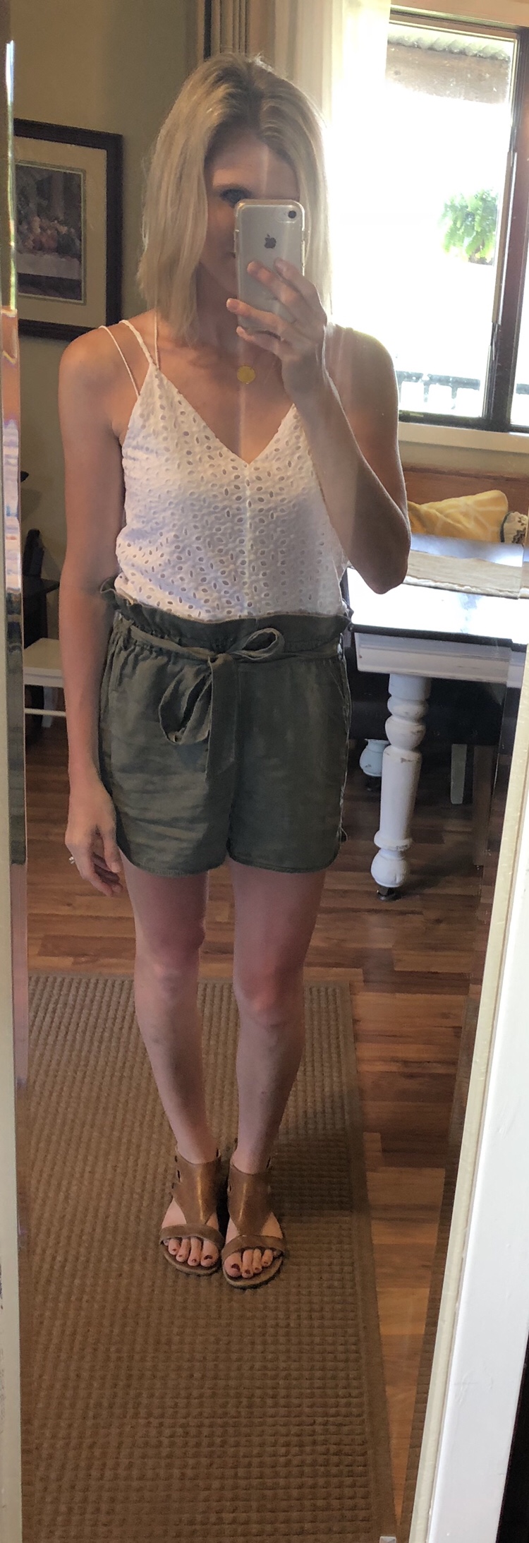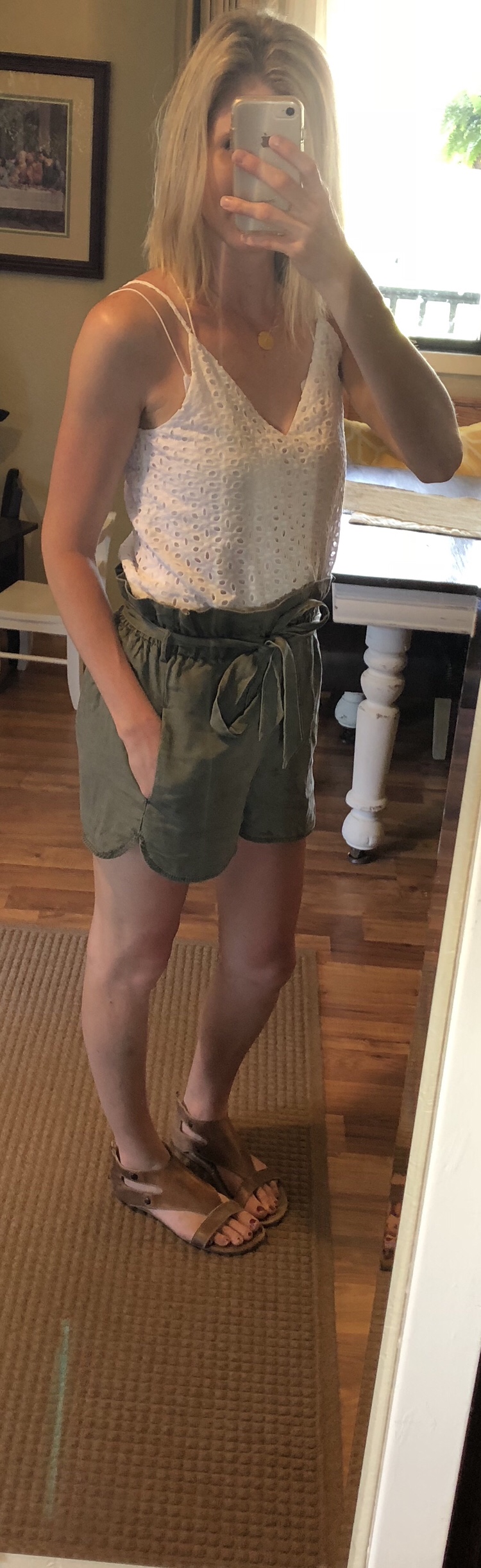Similar Top. Exact shorts (wearing 6), Sandals (true to size), and necklace.