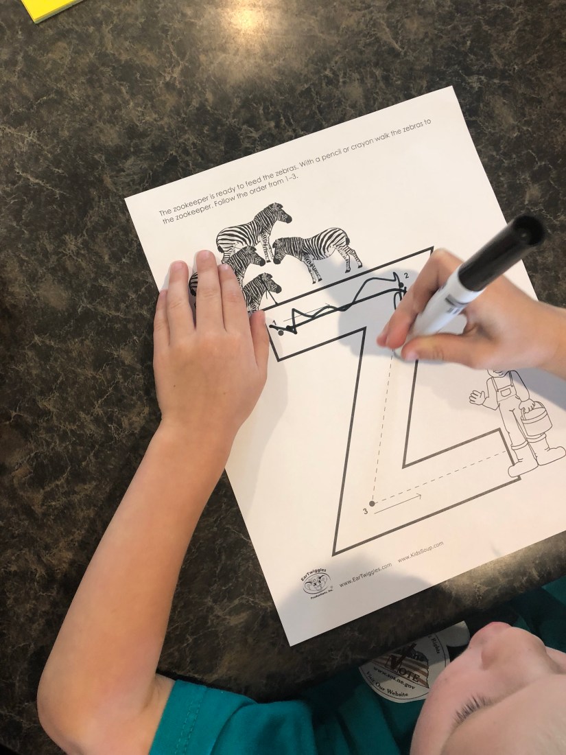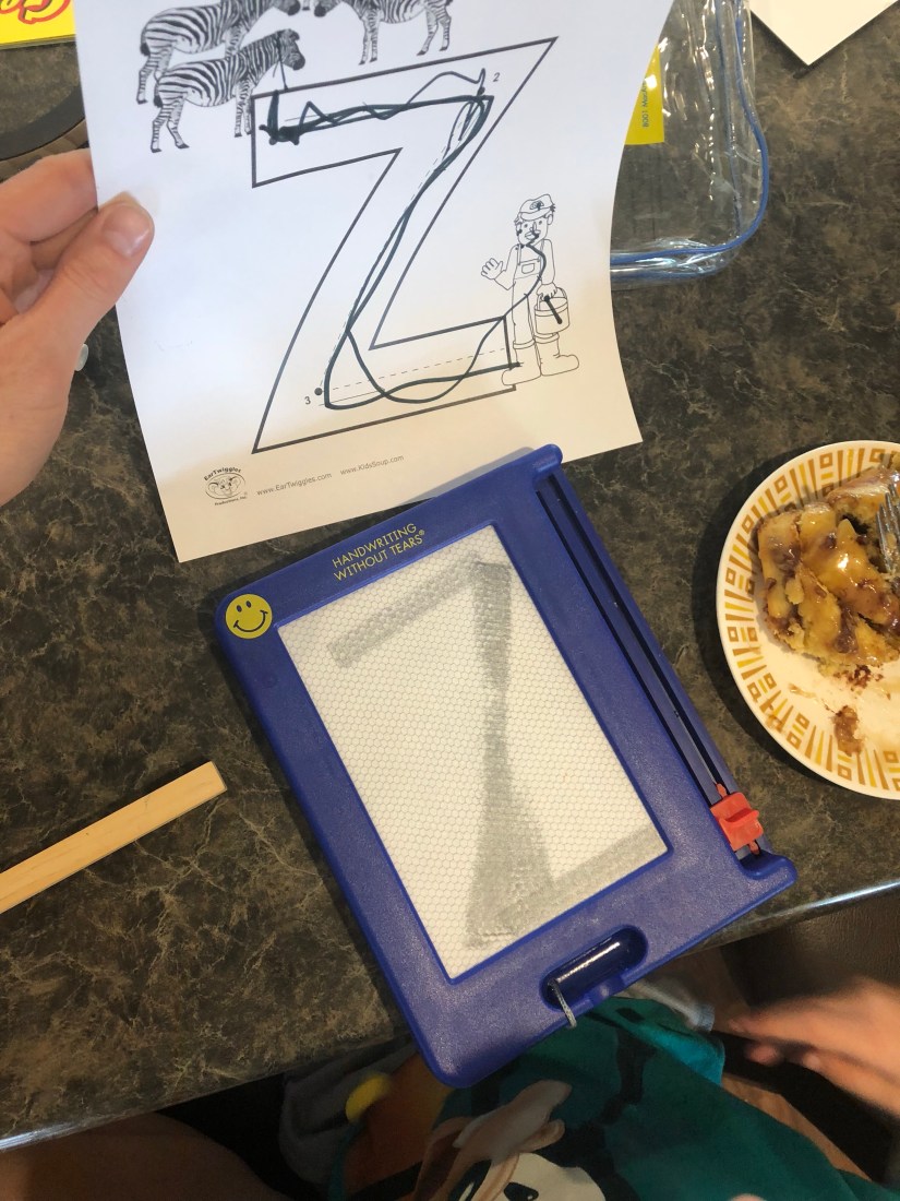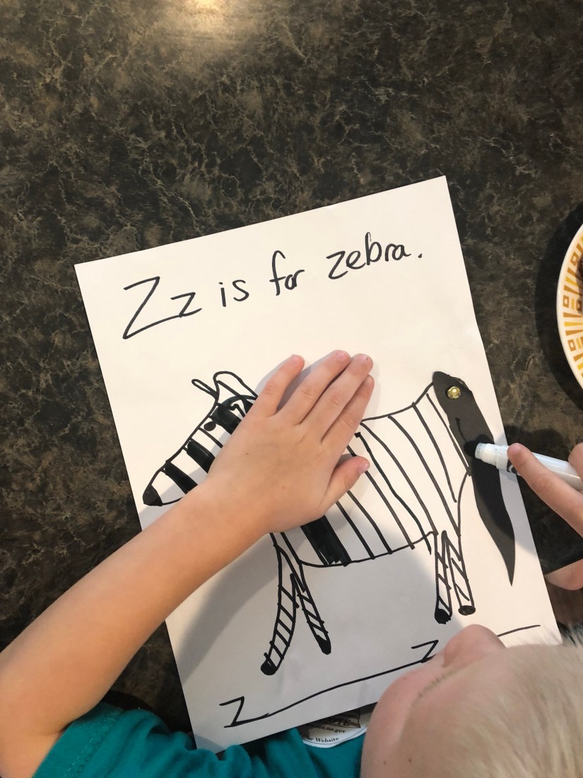 Our final page for our letter book is now complete. Z is for Zebra. I am NOT an excellent artist. My kids (at this age) really don’t care. They understand what I’m “trying” to make!!