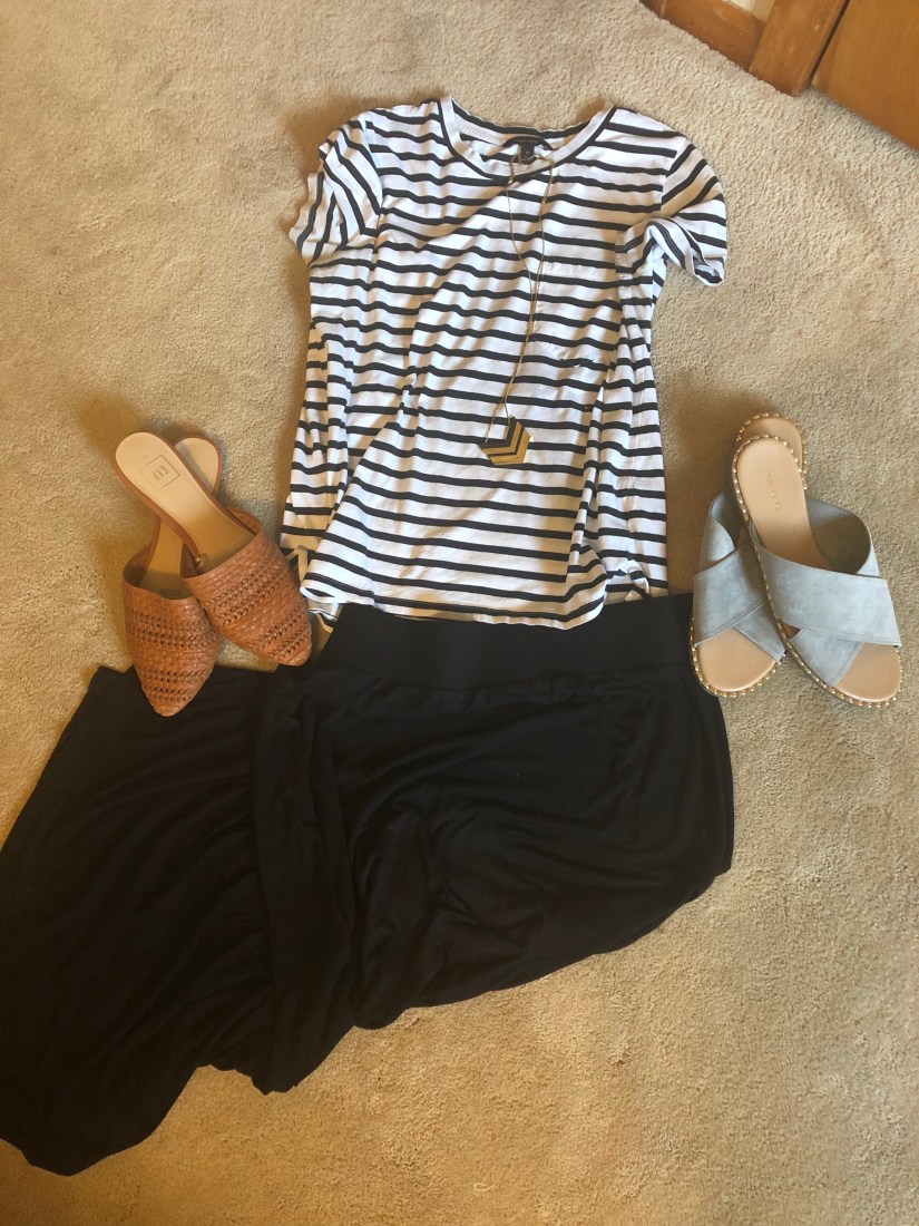 A favorite in Michelle’s closet, is her black Maxi skirt. She wears it a lot, and she wears it well. I tried to think of other ways for her to style it.