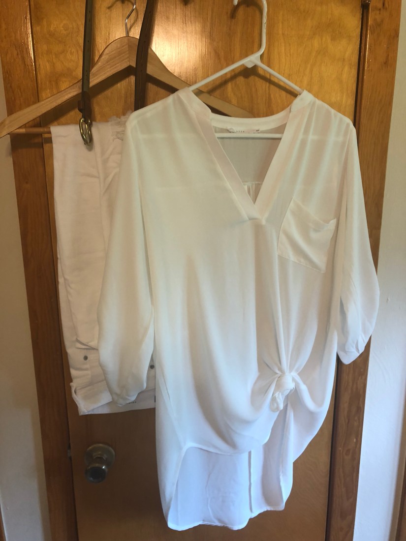 This tunic would also be great with blue jeans. Untucked, tucked or knotted. Michelle is not a shorts girl, but if she were, this tunic also looks fantastic with shorts!!