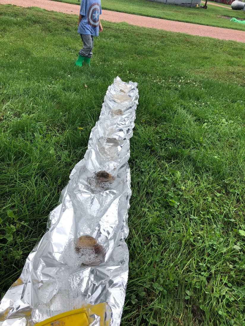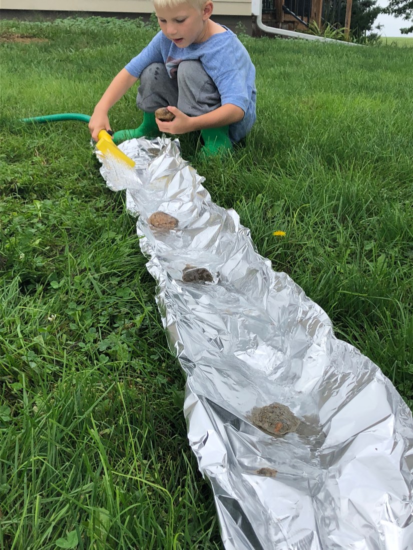 We created a tin foil river. This was a huge hit. Sam played with this for an hour after we were done with school. So fun!!