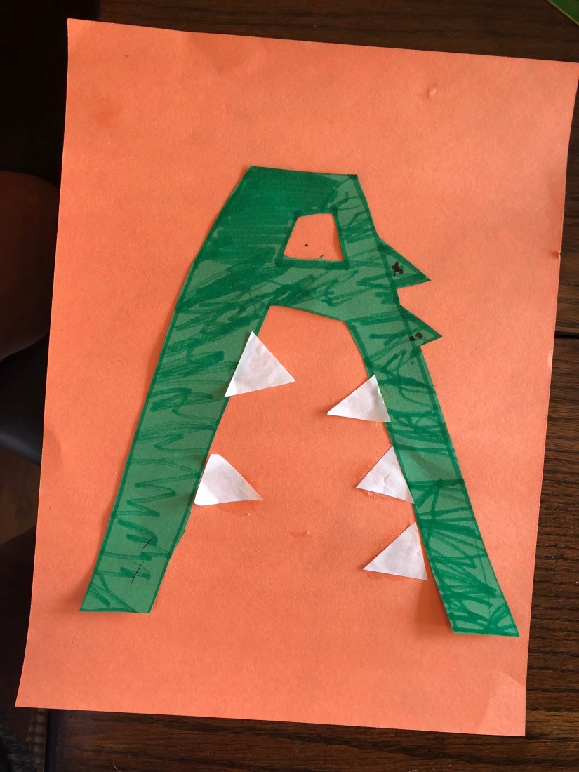 I drew an A on green construction paper. Then I let Sam color it with a green marker. I cut it out, and he glued it to orange paper. Then he glued on some white triangle teeth that I had cut out.