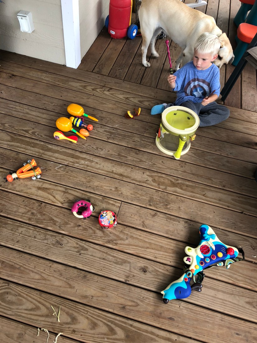 Next we played a gross motor bingo game. I set out a bunch of cones. Then I yelled out a color and Sam ran to it. He had to run because Max was picking them up. Ha!