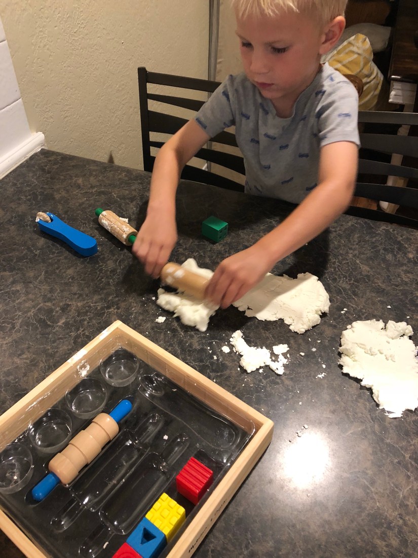 Today we kicked off our school year. Each day we start with the Lord’s Prayer, we fill in the calendar, and then I give Sam the choice of a puzzle, a learning toy, or a puzzle game.