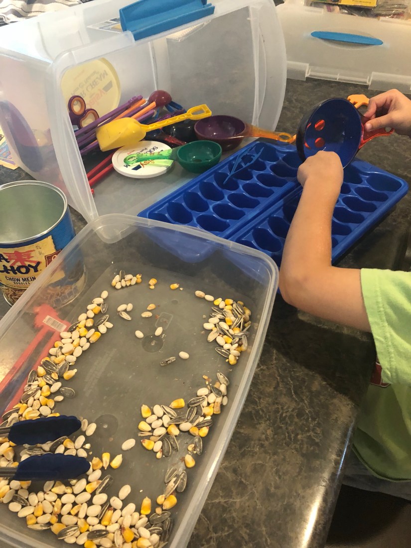 Fine seed sorting. I mixed a bunch of seeds and let Sam sort them with different tools.