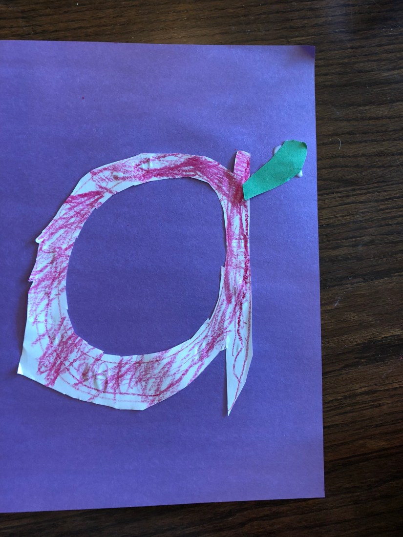 A is for Apple. We made a lower case “a” today. Sam colored the “a” and cut it out. My preschool crafts do not look perfect. If I wanted them perfect, I’d make the craft myself.