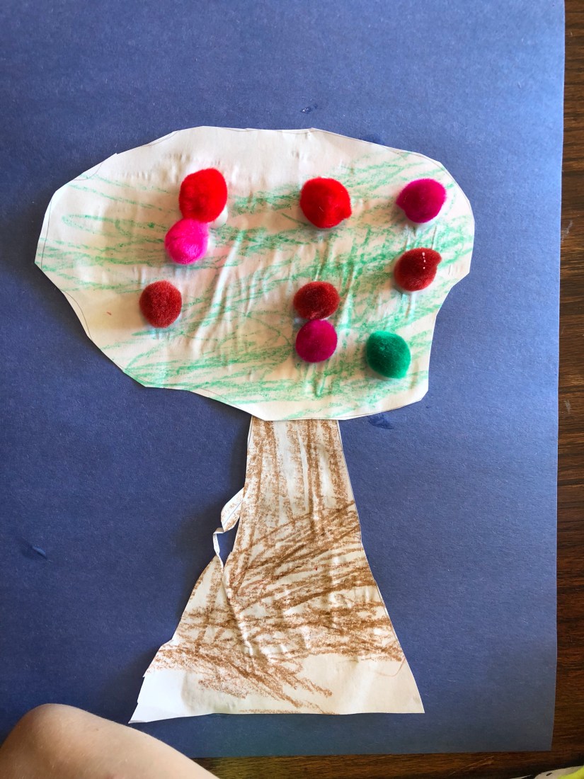 We made an apple tree next. Sam colored, I cut the tree out. Then we glued Pom poms on to look like apples.