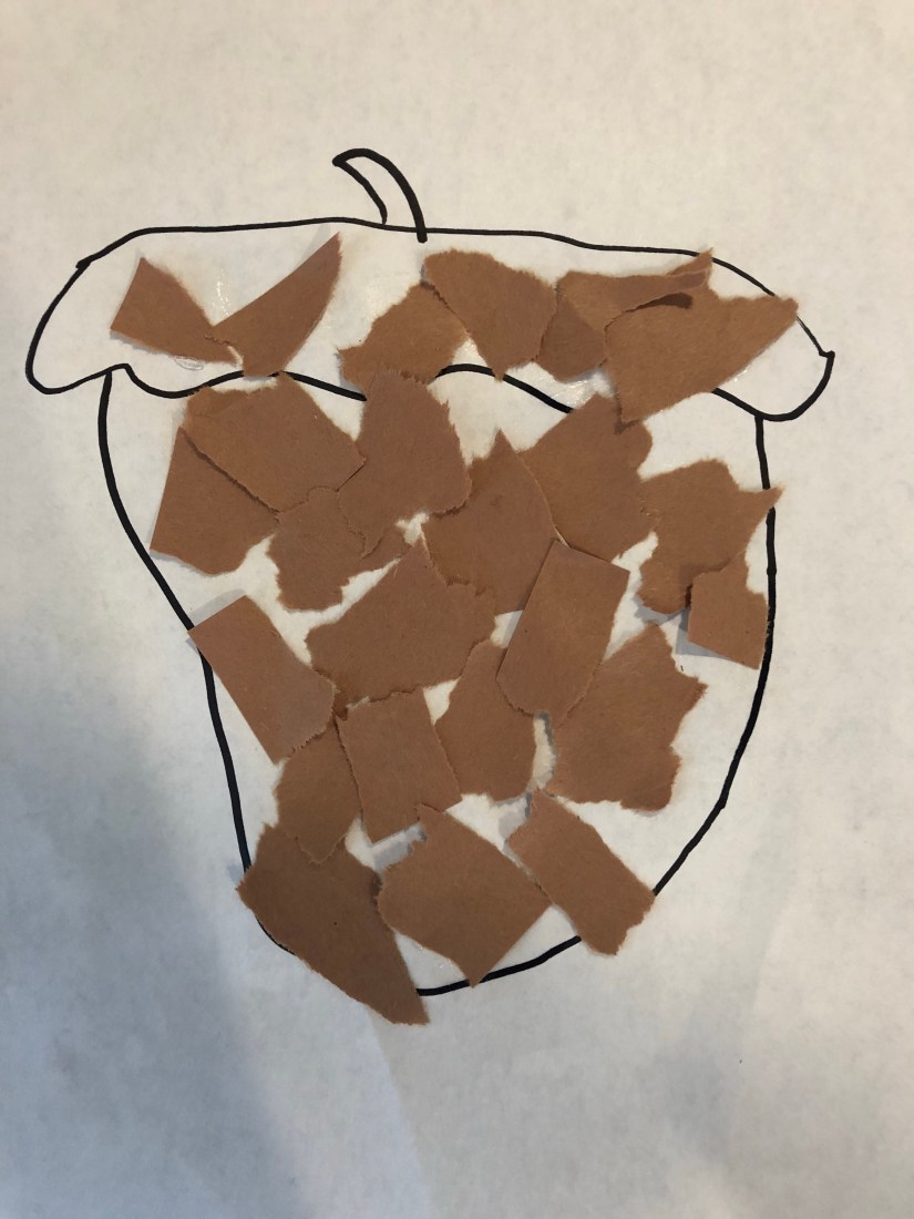 I drew an acorn on a piece of paper. Then I tore a bunch of brown construction paper. Sam glued on the construction paper.