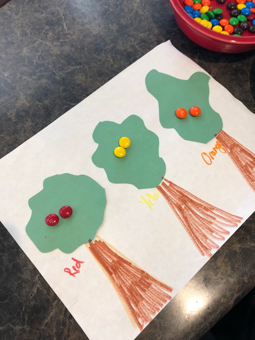 First Sam sorted out the M&Ms. Then I had him count each color. I asked him which had the most, but this question was a little much for him. No worries, we moved right on. 😉