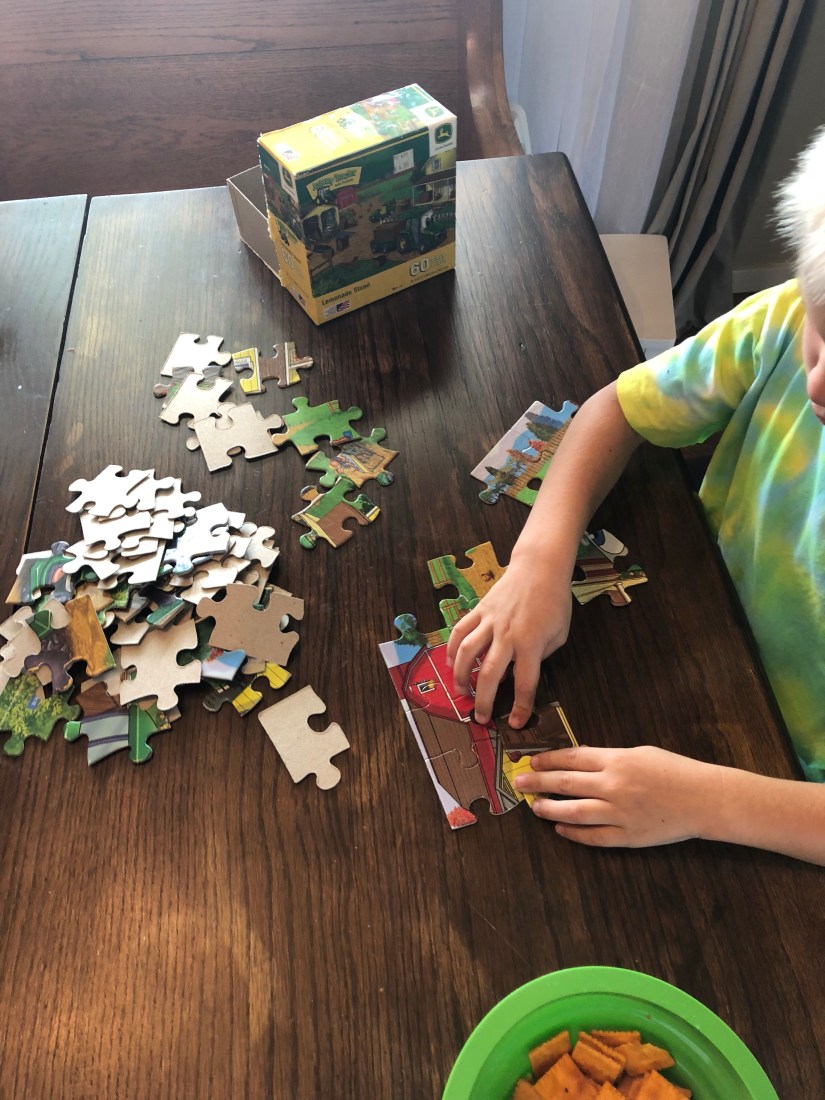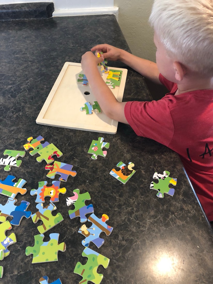 Sam chose a puzzle again today. This is not a puzzle I would recommend. It’s a Target brand puzzle, and it is not user friendly for little fingers. Puzzles are like shoes, invest in good quality. Melissa and Doug brand have the best puzzles.