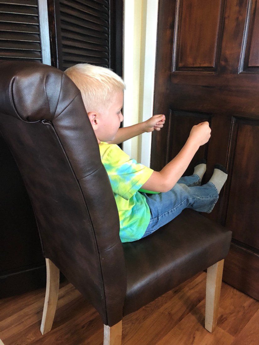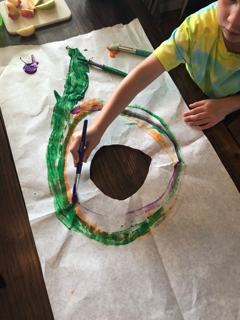 The last thing I had Sam do was paint around the hole I cut out. Just painting circles. This is a fine motor building skill.