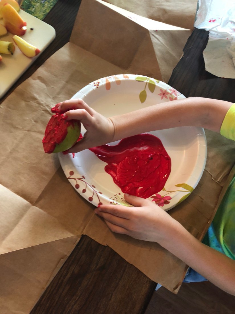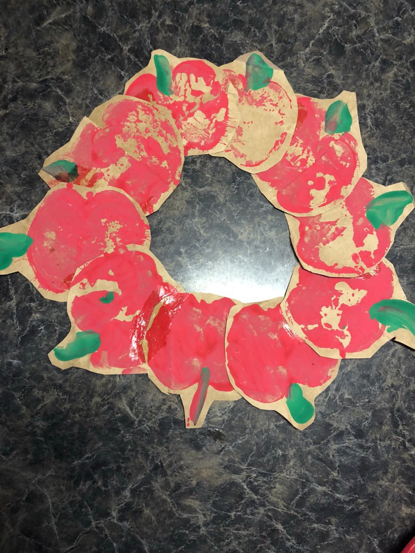We made an apple wreath next. Sam stamped apples on a paper sack.