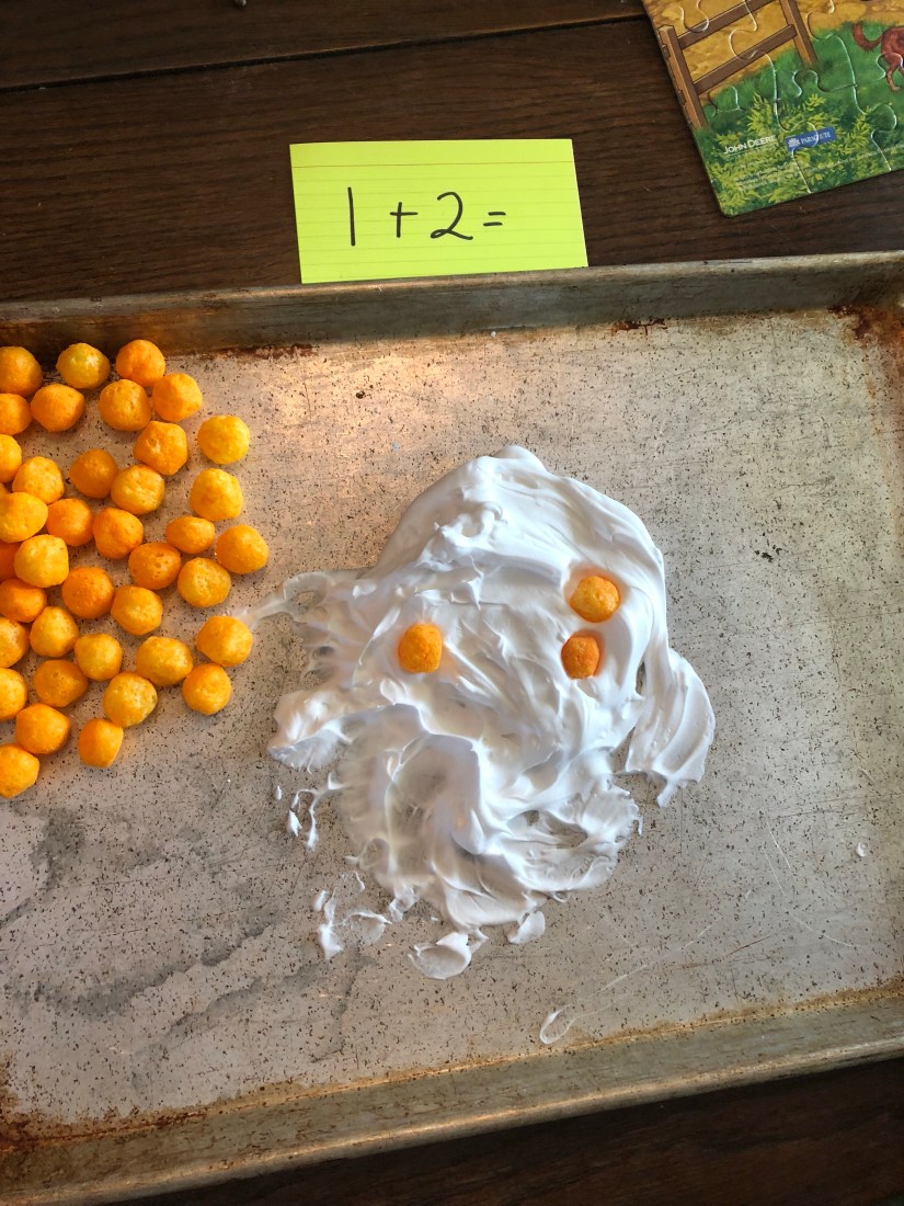 Sam thew in the first number, then the second. I had him count all the cheese balls for a total number.