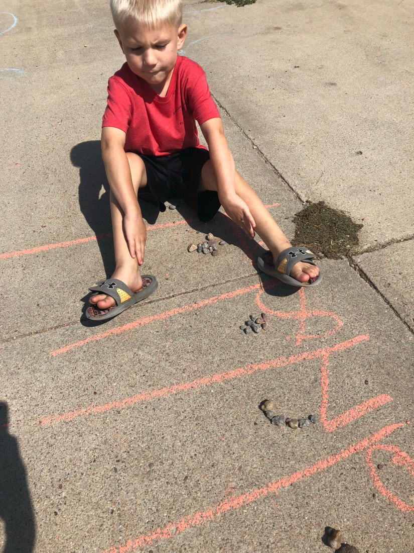 I drew a number line. Sam was instructed to gather rocks for each number.